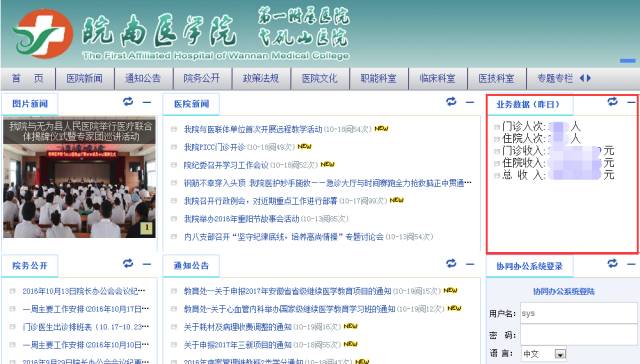 通過OA系統與醫院HERP系統進行整合,將醫院每天的門診人次、住院人次、門診收入、住院收入、總收入數據展示在系統登錄頁,極大的方便了醫院員工及時了解每天的醫院業務數據,直觀又便捷。